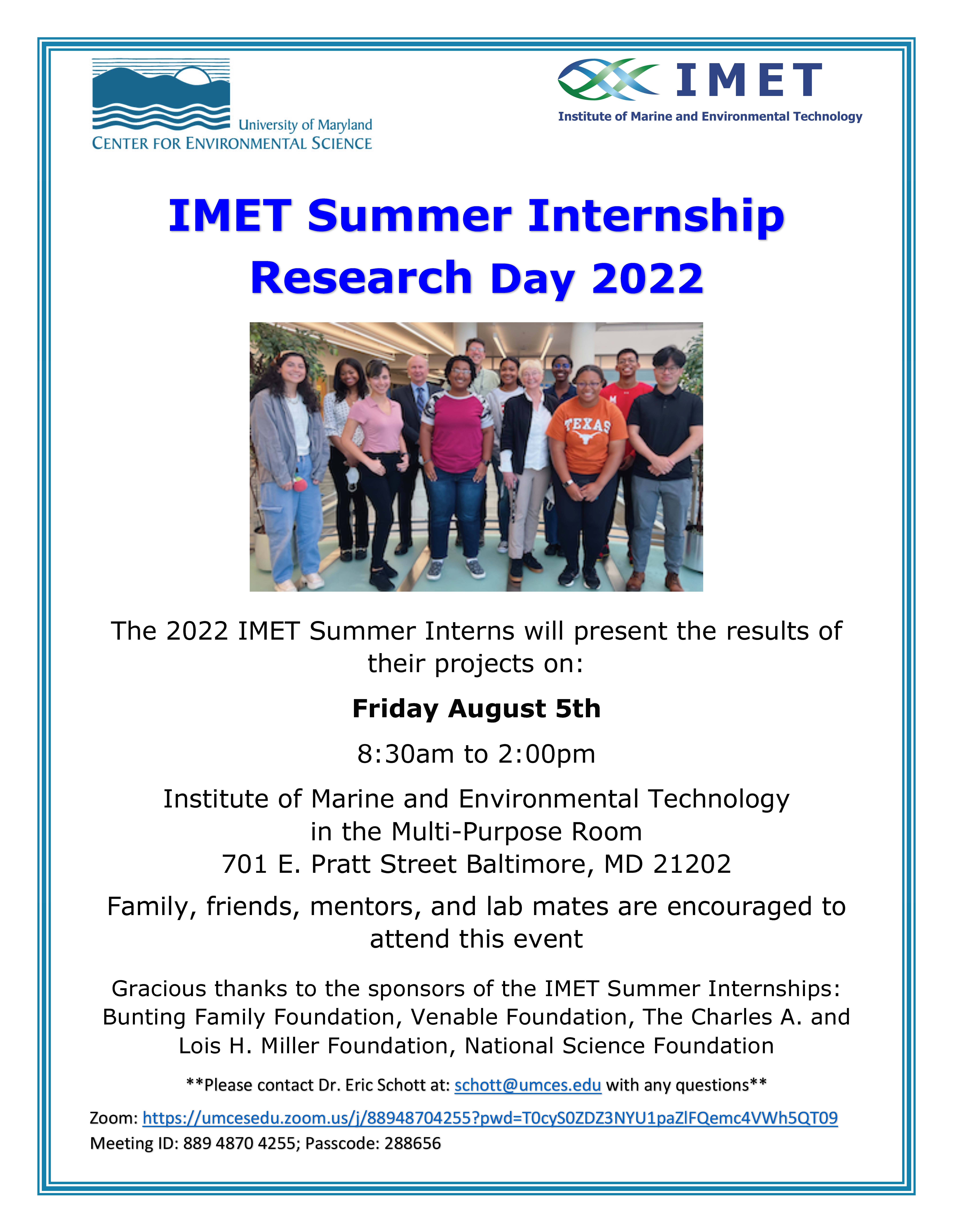 Location Online Date & Time August 5, 2022, 8:30 am – 2:00 pm Description Attached Flyer for IMET Summer Internship Research Day